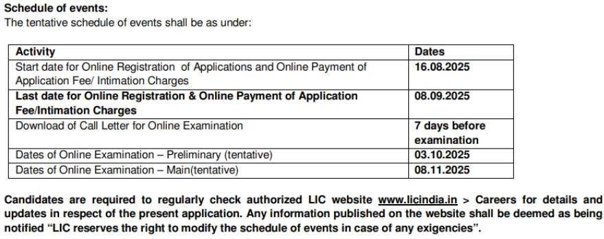 Preliminary and main examination dates for LIC AAO Released on the LIC Official Website. On October 3, 2025, LIC AAO Prelims Exam will be conducted, and on November 8, 2025, there will be Mains Examination.