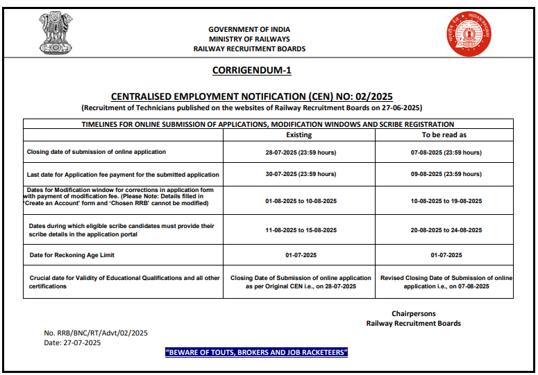 | Dates for Modification window for corrections in the application form with payment of modification fee (Please Note: Details filled in ‘Create an Account’ form and ‘Chosen RRB’ cannot be modified) | 10th to 19th August 2025 |