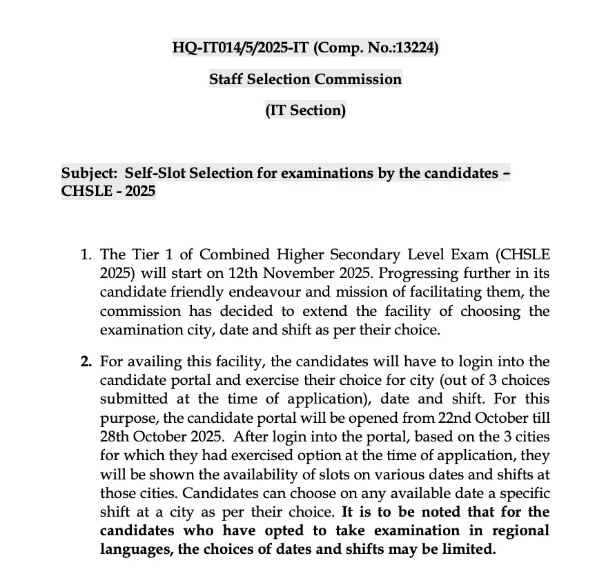 The Staff Selection Commission has officially announced the exam date for Tier 1 of SSC CHSL 2025 Exam. As per the notice, the tier 1 exam will start from 12th November 2025 onwards. SSC will begin to release the exam city intimation slips in the 1st week of November 2025 and admit card in 1st week of November 2025.
